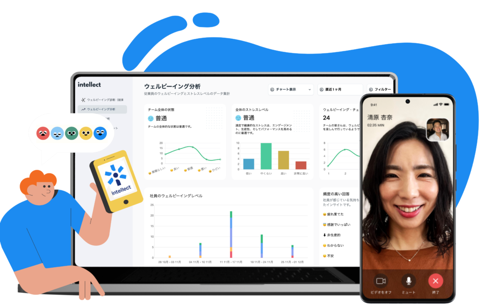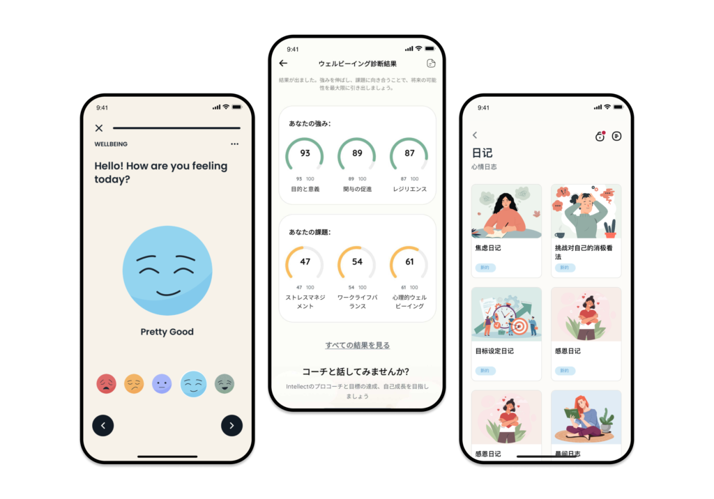 Intellectは、全方位型のプラットフォームです。従業員はそれぞれにとって最適な時間や場所からサービスを利用できるため、高い利用率を実現。対話を通じた人材の育成支援から個別特化したケアなど、組織ごとの課題に応じた支援を提供しています。