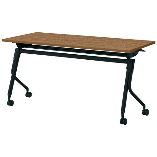 「Linello(リネロ)3」フォールディングテーブル(棚付)ブラック脚/幅1500×奥450mm/天板色ミディアムウッド。高さ調整機能付きのキャスターなので、床の状態によって起こる天板の高さ違いをフラットに調整できます(+10mmまで調節可能)。別売りの幕板の取り付けが可能です。