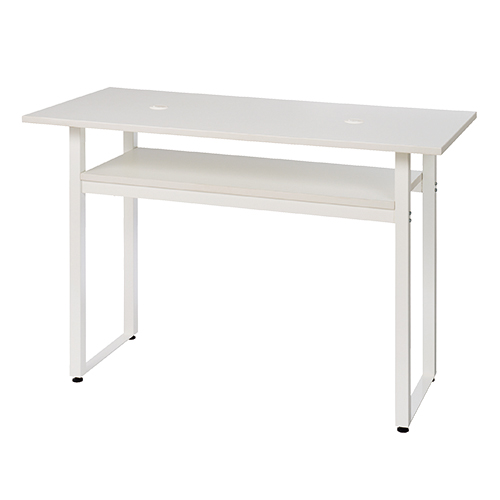 ホワイトカラーの天板下に高さ210mmの棚付きハイテーブル。配線孔は2カ所ついているので柔軟に配線できます。