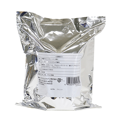 450枚入り。大容量の詰め替え用アルコールタイプの除菌ウェットシートです。乾きを防止するアルミ蒸着パッケージ仕様です。