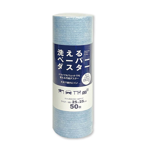 洗えるペーパーダスター50枚。ドライでもウェットでもどちらでも使える万能タイプです。コンパクトなロールタイプで25cm毎にミシン目が入り、必要な分だけカットして使用出来ます。2~3回は洗って再利用可能です。