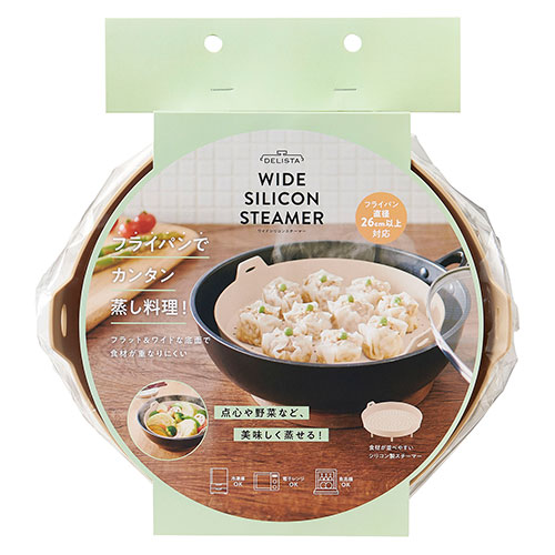フラット&ワイドな底面で食材が重なりにくい。点心や野菜など、美味しく蒸せる!フライパン直径26cm以上対応。食材が並べやすいシリコン製スチーマー。冷凍庫OK、電子レンジOK、食洗機OK。