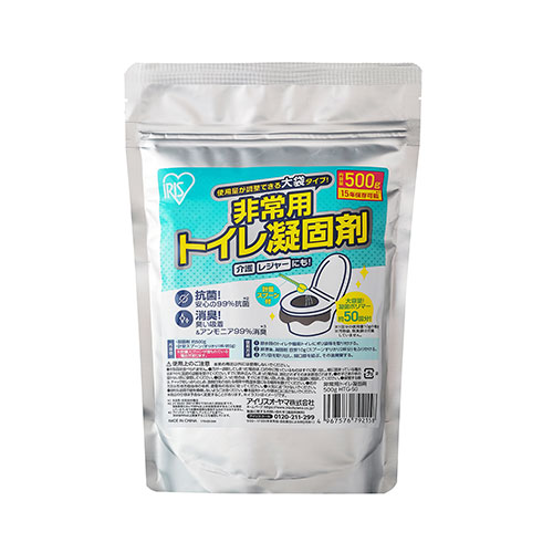 使用量が調整できる大袋タイプの非常用トイレ凝固剤です。子供のいる家族世帯などに便利です。凝固剤を振りかけると汚物を固めることができます。災害時や断水時の備え、レジャー、介護用トイレに使用可能です。計量スプーン付きです。99%抗菌(※1)、臭い吸着&アンモニア99%消臭(※2)できて衛生的です。素早く固まるので後処理が簡単です。密封性・防湿性を備えたアルミ袋により、15年の長期保存可能。