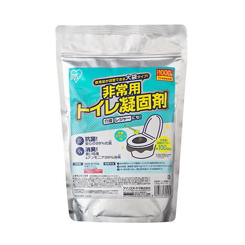 使用量が調整できる大袋タイプの非常用トイレ凝固剤です。子供のいる家族世帯などに便利です。凝固剤を振りかけると汚物を固めることができます。災害時や断水時の備え、レジャー、介護用トイレに使用可能です。計量スプーン付きです。99%抗菌(※1)、臭い吸着&アンモニア99%消臭(※2)できて衛生的です。素早く固まるので後処理が簡単です。密封性・防湿性を備えたアルミ袋により、15年の長期保存可能。